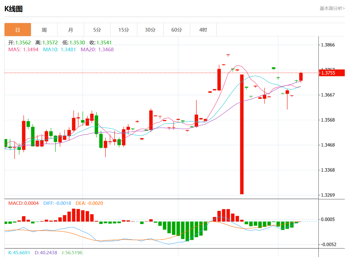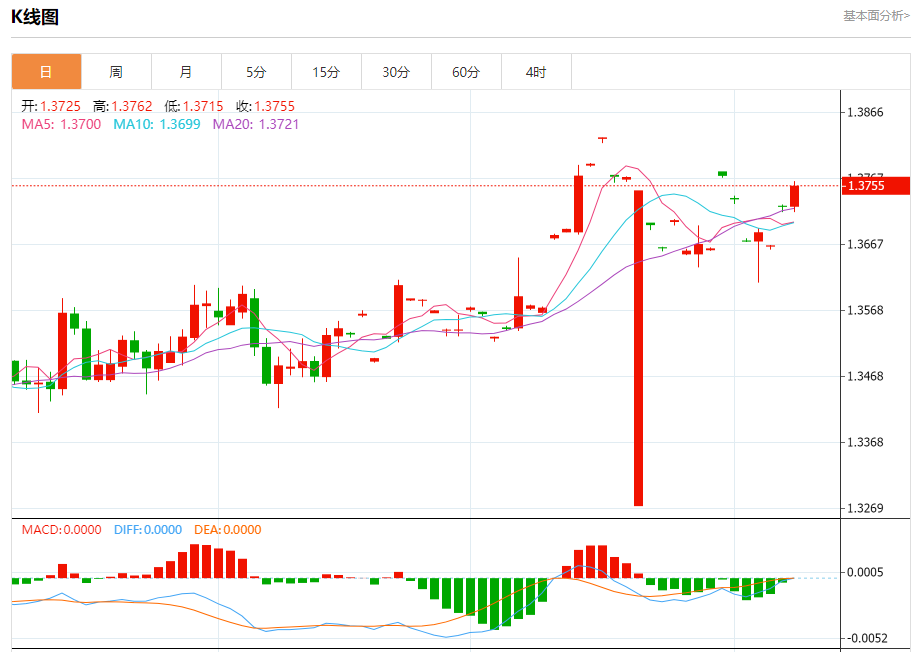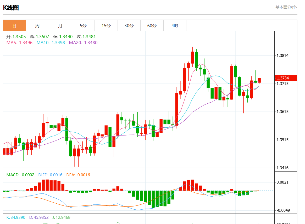 周三盘中,美元/加元报1.3755,涨幅0.21%。 今日分析:在1.3720之上,看涨,目标价位为1.3770,然后为1.3785。 技术点评:RI技术指标向上运行。 支撑位:1.38001.37851.3770 阻力位:1.37201.37051.3690 (亚汇网编辑:静香)