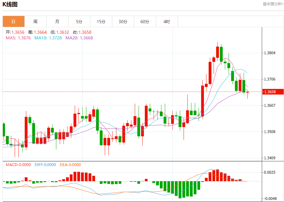 周五盘中,美元/加元报1.3648,跌幅0.06%。 今日分析:在1.3665之下,看跌,目标价位为1.3635,然后为1.3620。 技术点评:RI技术指标运行趋势复杂,倾向于下跌。 支撑位:1.37051.36801.3665 阻力位:1.36351.36201.3600 (亚汇网编辑:静香)