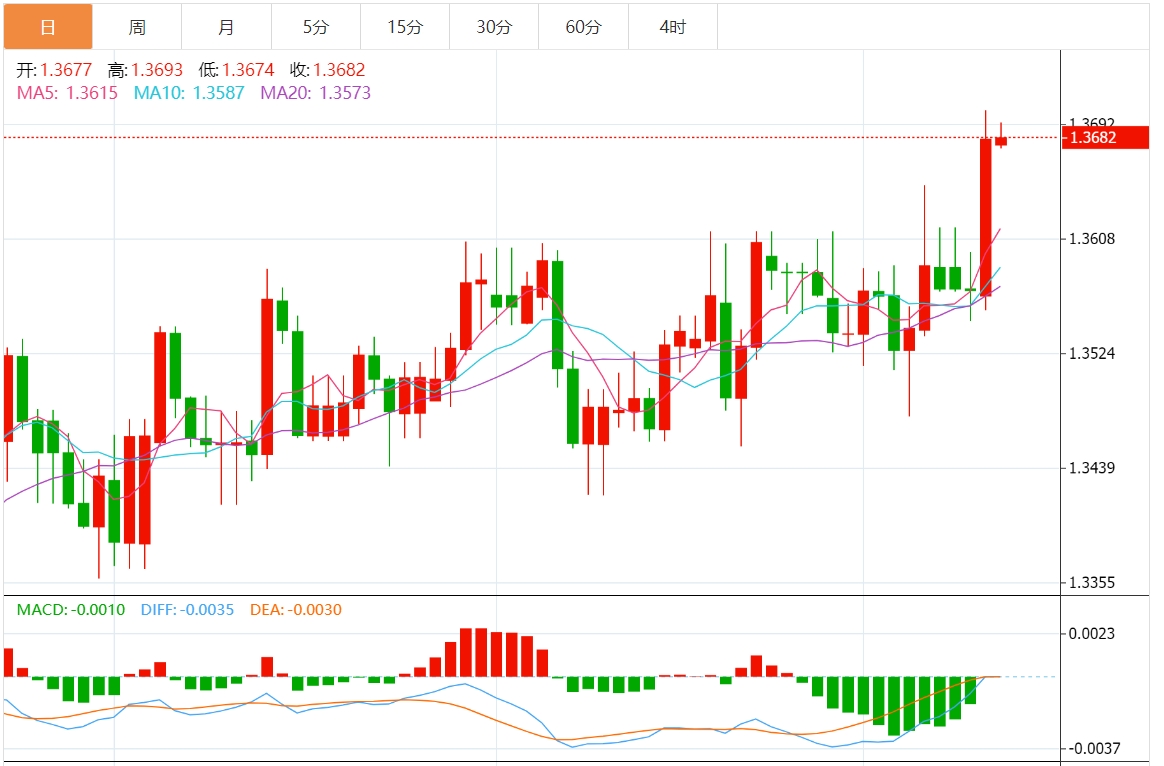 周四盘中,美元/加元报1.3681,涨幅0.01%。 今日分析:在1.3650之上,看涨,目标价位为1.3710,然后为1.3735。 技术点评:即使我们不能排除持续调整的可能性,其时间长度上,应该是有限的。 支撑位:1.37601.37351.3710 阻力位:1.36501.36251.3600 (亚汇网编辑:静香)