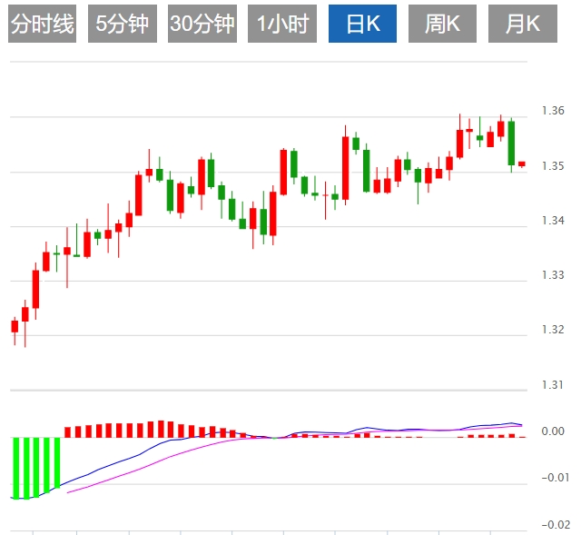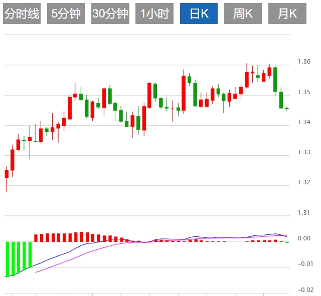 周二盘中,美元/加元报1.3473,跌幅0.07%。 今日分析:在1.3490之下,看跌,目标价位为1.3465,然后为1.3450。 技术点评:RI技术指标运行趋势复杂,倾向于下跌。 支撑位:1.35251.35101.3490 阻力位:1.34651.34501.3430 (亚汇网编辑:静香)