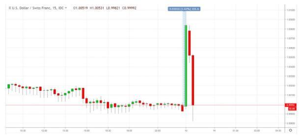 行情数据显示,瑞郎日内6:03分左右突现闪崩行情,10分钟内暴跌近百点,美元兑瑞郎从1.0000飙升至1.0100,随后瑞郎又迅速收复跌幅,兑美元回到平价关口附近。