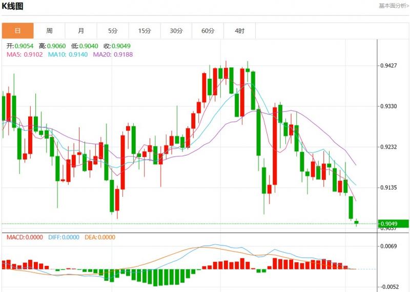 周三盘中,美元瑞郎报0.9048,跌幅0.13%。