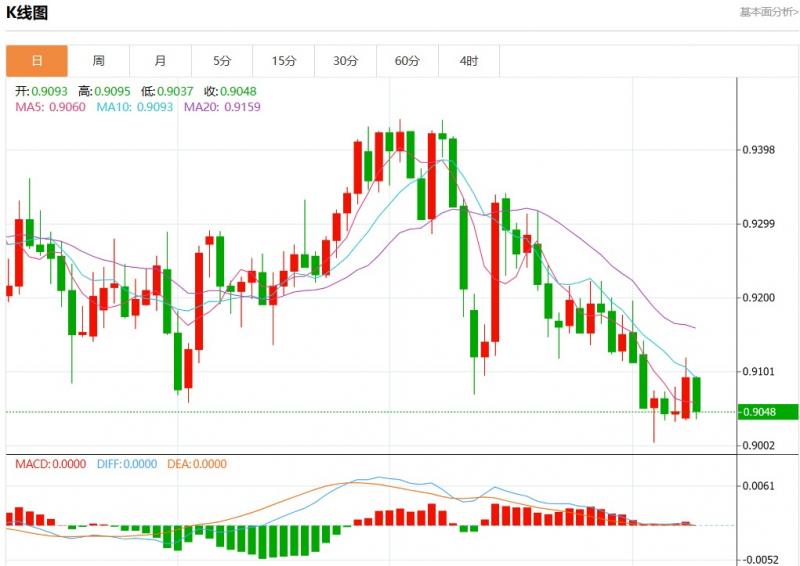 周二盘中,美元瑞郎报0.9050,跌幅0.49%。