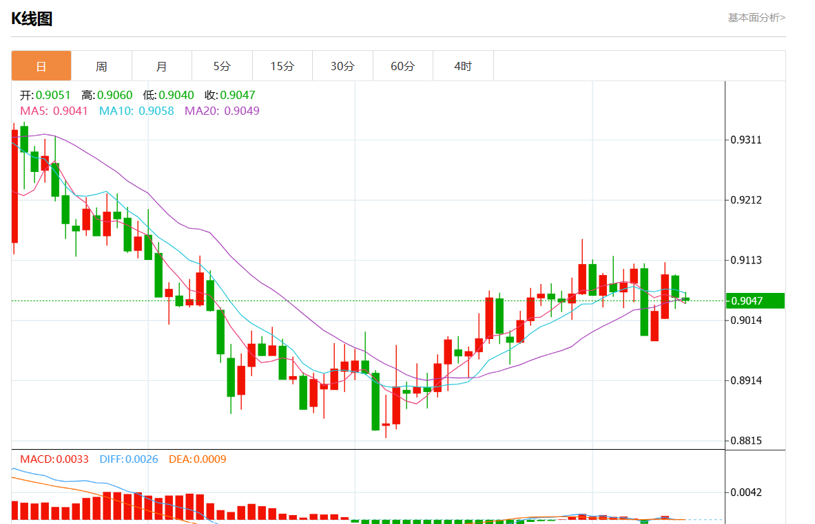 周三盘中,美元/瑞郎最新报0.9046,日图跌0.05%