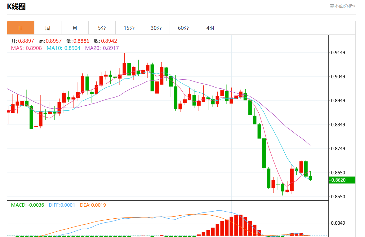 周三盘中,美元/瑞郎报0.8620,跌幅0.17%。
