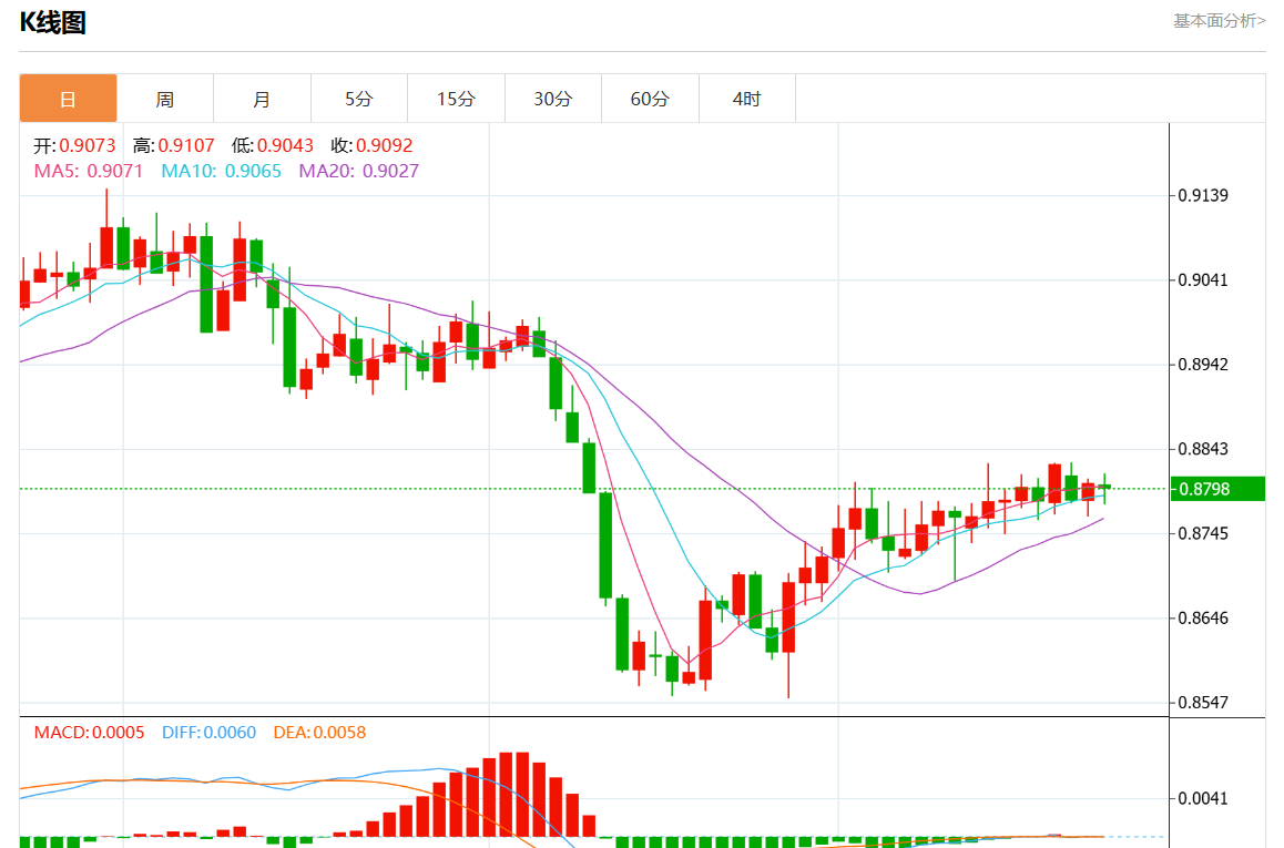 周三盘中,美元/瑞元报0.8795,跌幅0.09%。