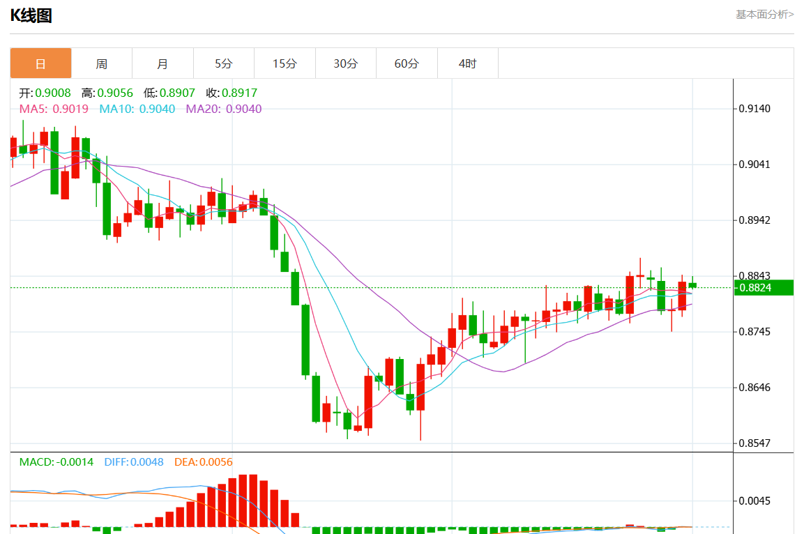 周五盘中,美元/瑞元报0.8824,跌幅0.10%。