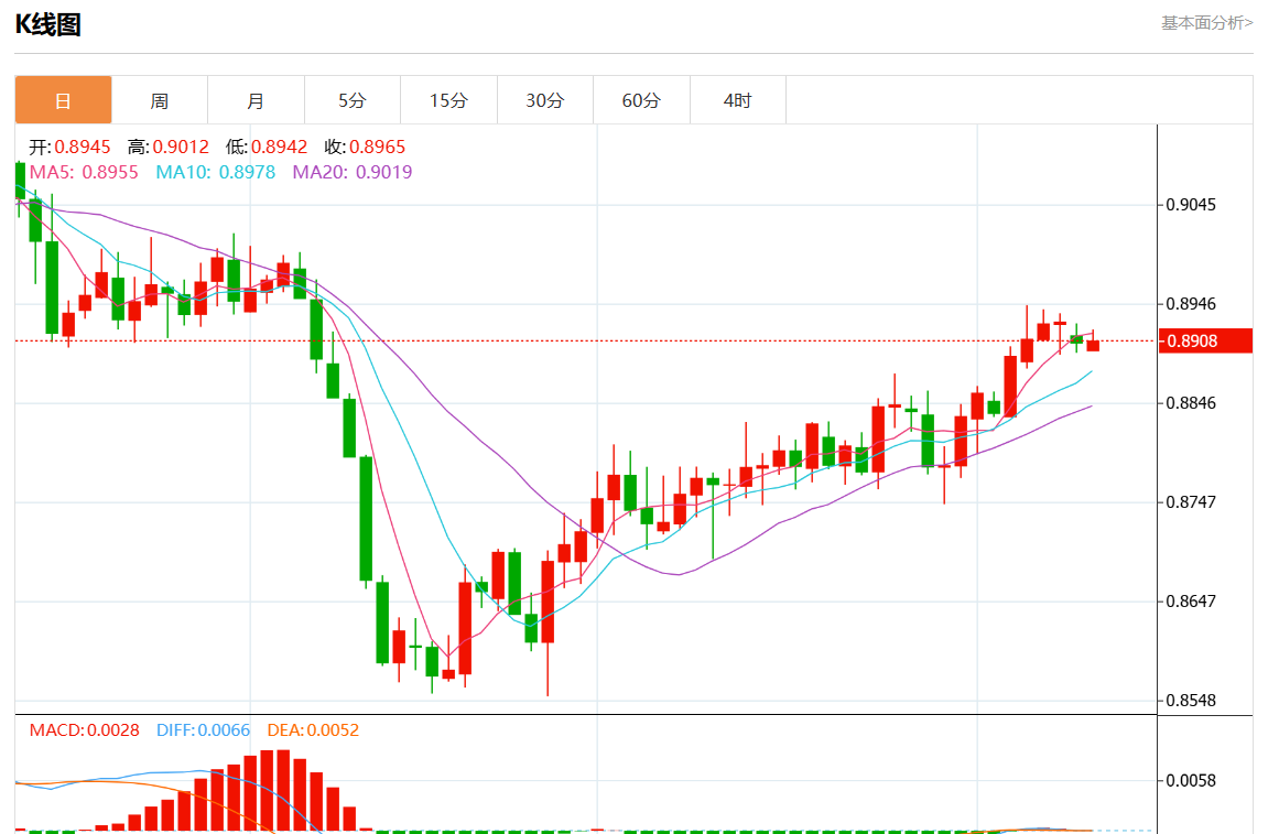 周二盘中,美元/瑞元报0.8908,涨幅0.01%。