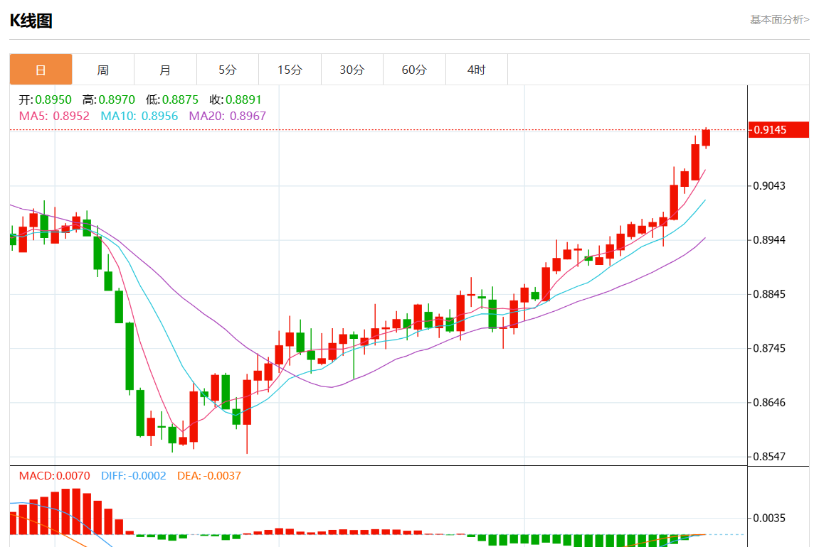 周二盘中,美元/瑞元报0.9137,涨幅0.20%。