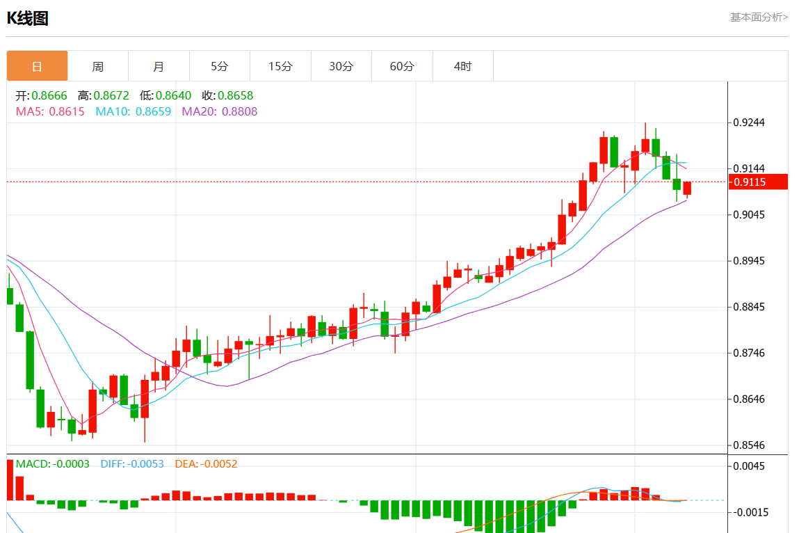 周一盘中,美元/瑞元报0.9117,涨幅0.19%。
