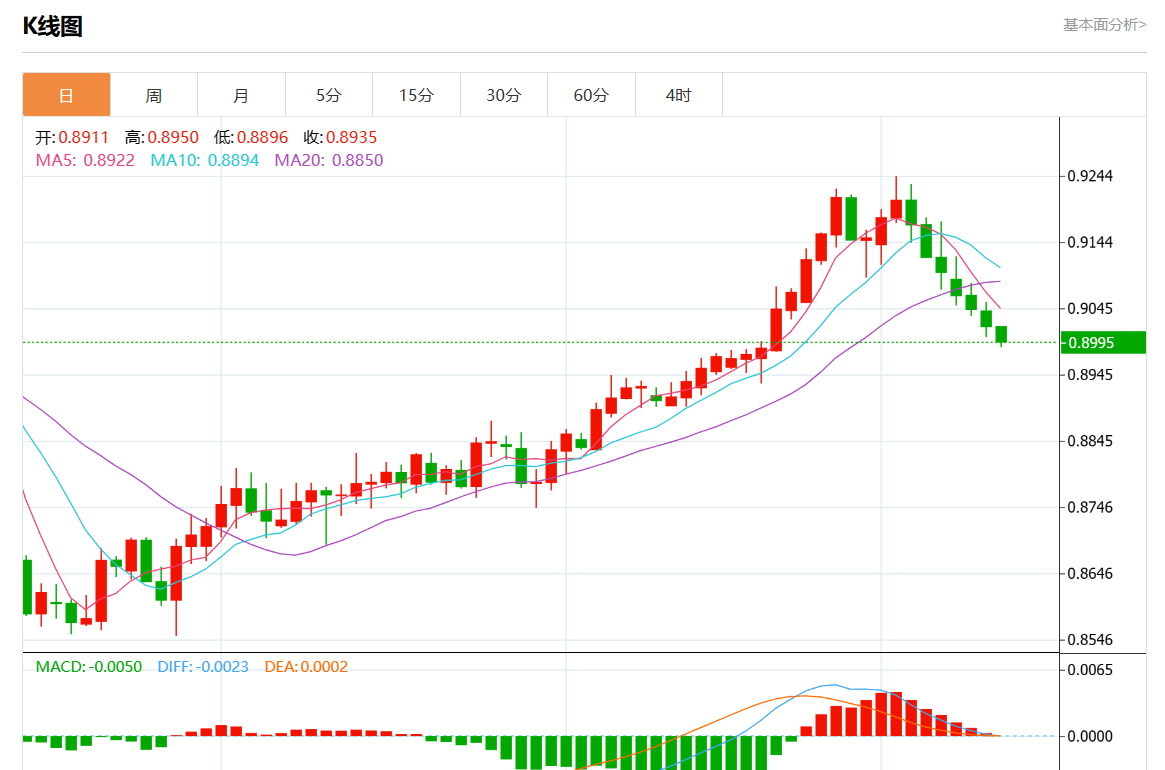 周四盘中,美元/瑞元报0.9000,跌幅0.20%。