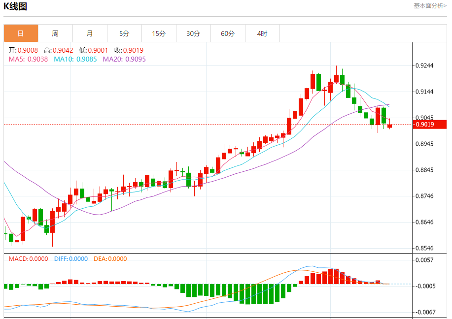 周一纽盘,瑞郎兑美元交投于0.9021,跌幅为0.06%。