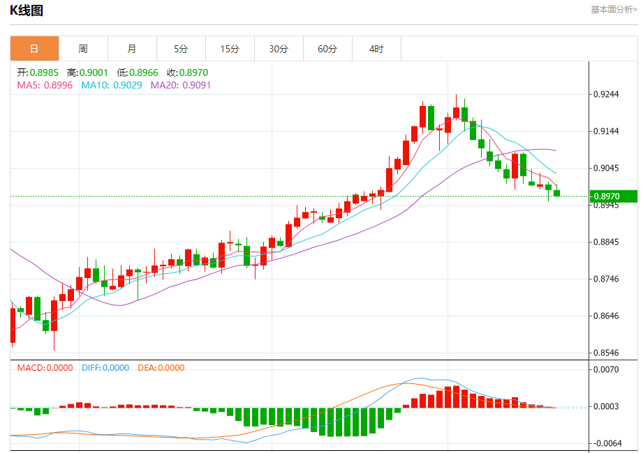 周四纽盘,瑞郎兑美元交投于0.8971,跌幅为0.19%。