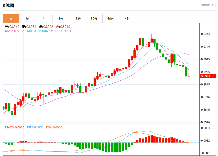 周五纽盘,瑞郎兑美元交投于0.8916,涨幅为0.04%。