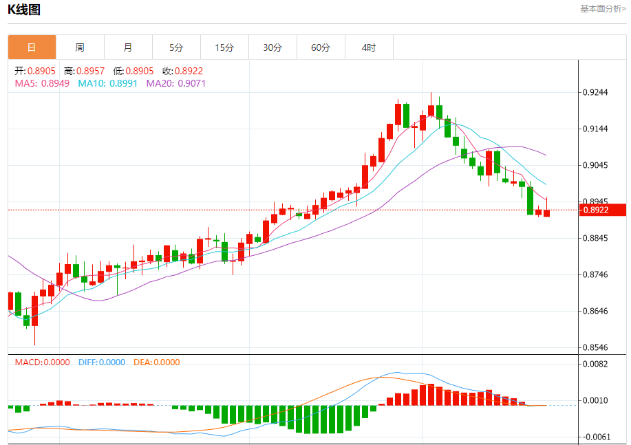 周一纽盘,瑞郎兑美元交投于0.8924,跌幅为0.01%。