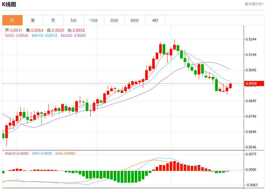 周三纽盘,瑞郎兑美元交投于0.8960,涨幅为0.31%。