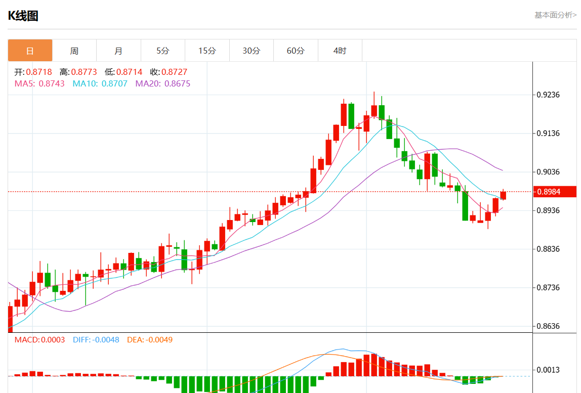 周四盘中,美元/瑞元报0.8986,涨幅0.22%。