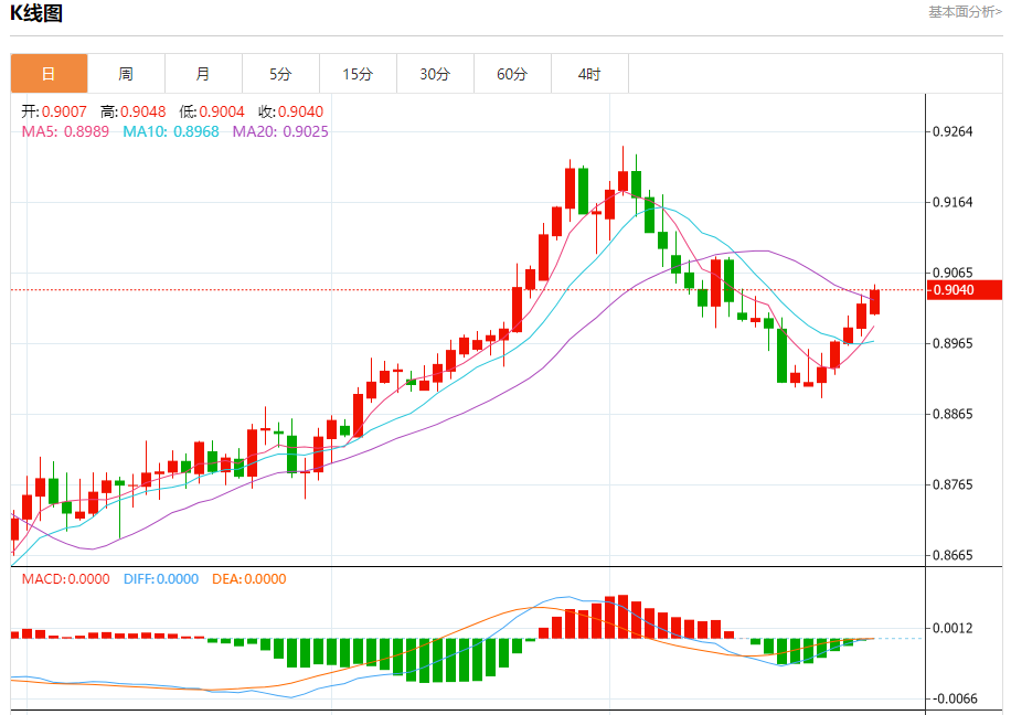周一纽盘,瑞郎兑美元交投于0.9041,涨幅为0.20%。