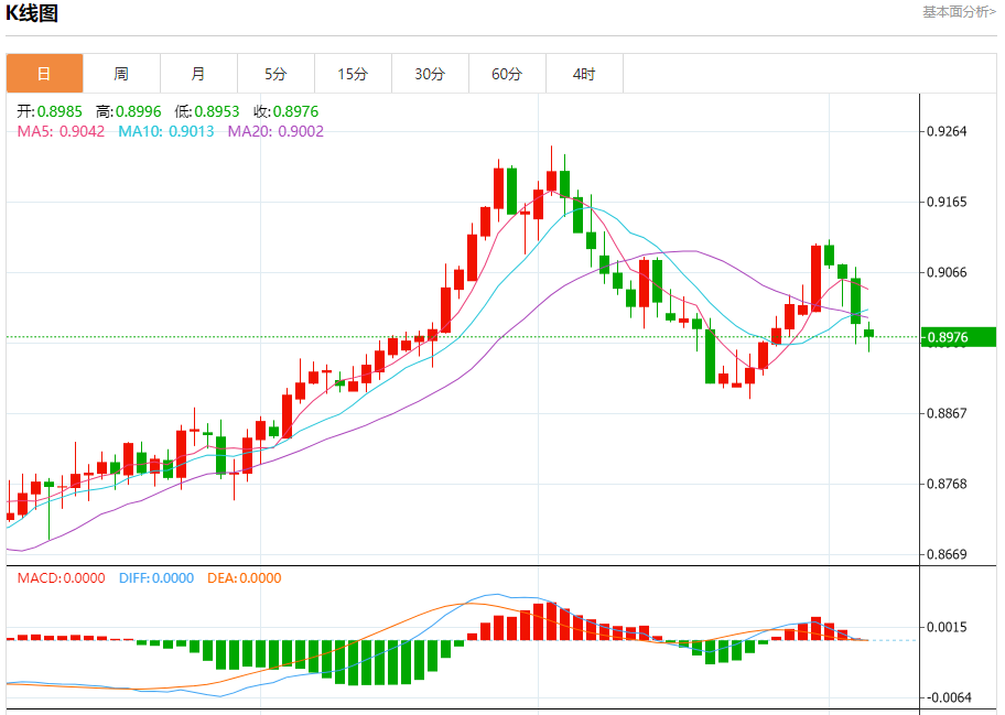 周一纽盘,瑞郎兑美元交投于0.8978,跌幅为0.20%。