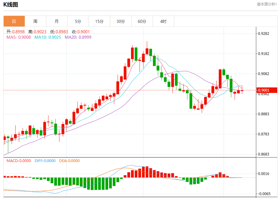 周三纽盘,瑞郎兑美元交投于0.9002,涨幅为0.01%。