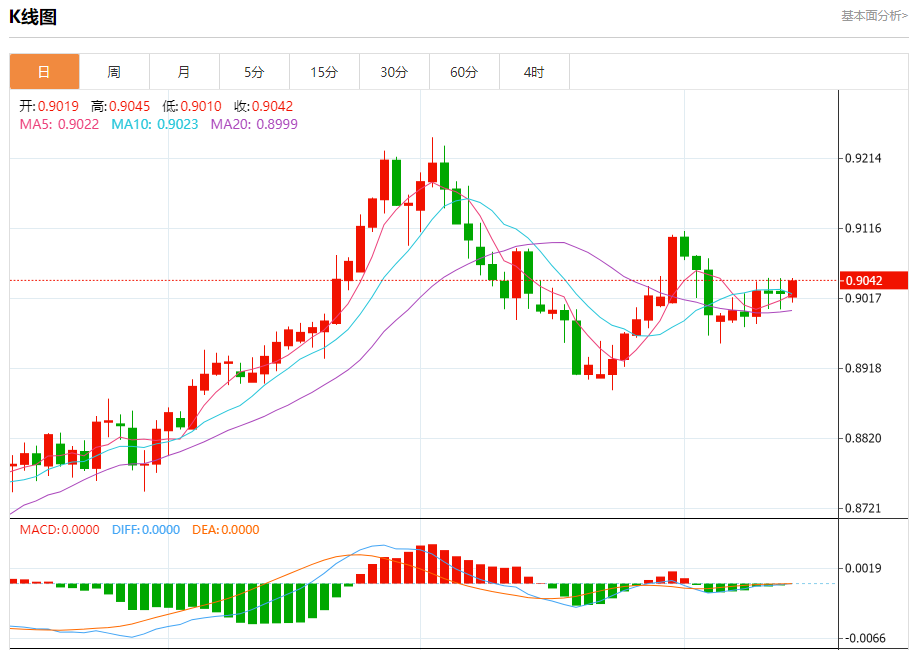 周一纽盘,瑞郎兑美元交投于0.9043,涨幅为0.20%。