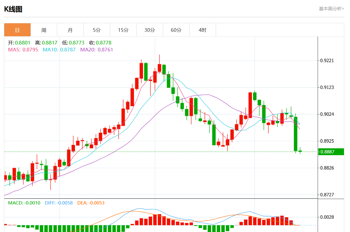 周三盘中,美元/瑞元报0.8888,跌幅0.01%。