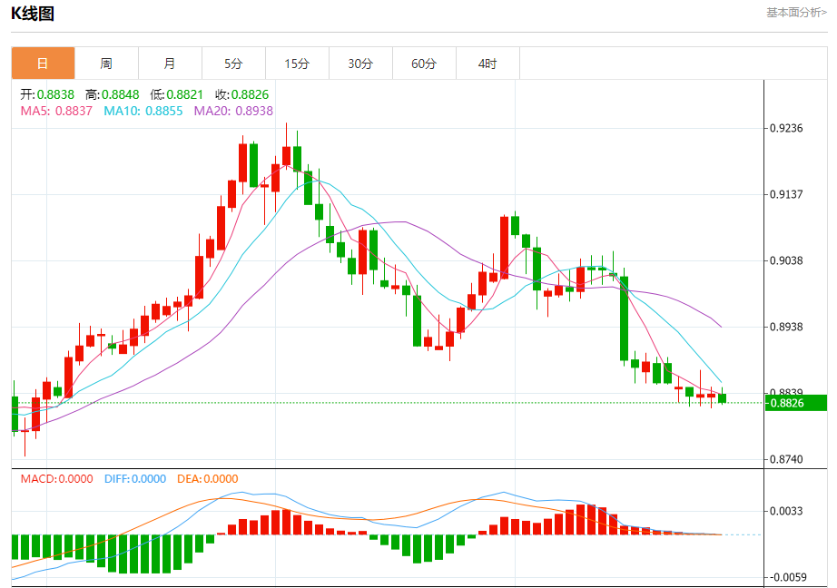 周五纽盘,瑞郎兑美元交投于0.8828,跌幅为0.12%。