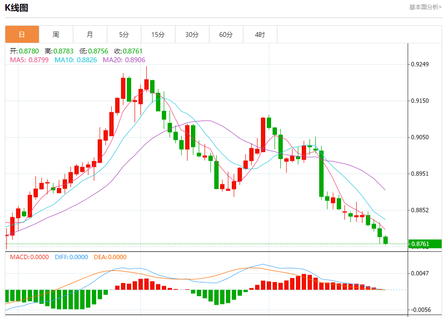周三纽盘,瑞郎兑美元交投于0.8762,跌幅为0.21%。