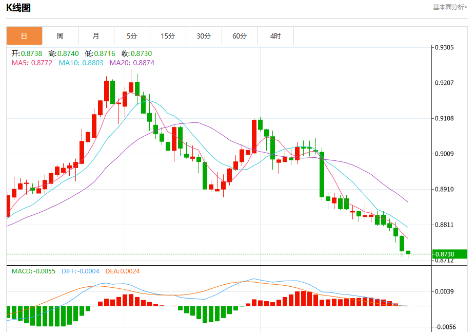 技术点评:跌破0.8755,为空头信号,向下的目标将会是0.8700。