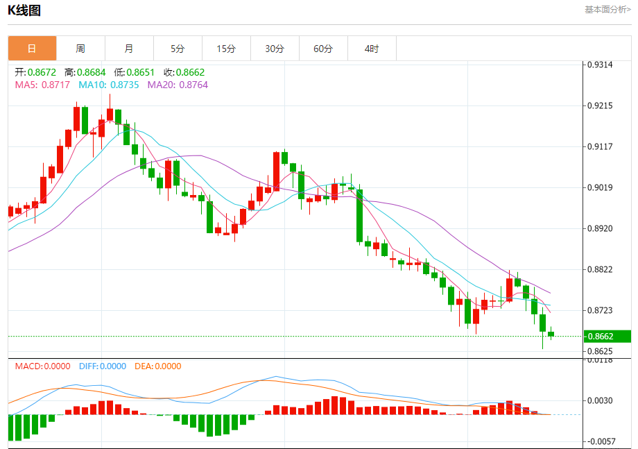 周五纽盘,瑞郎兑美元交投于0.8664,跌幅为0.14%。