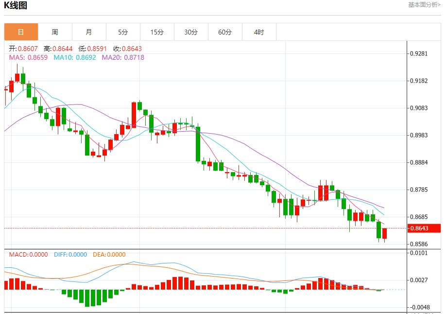 周三纽盘,瑞郎兑美元交投于0.8646,涨幅为0.41%。