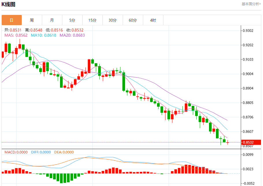 周三纽盘,瑞郎兑美元交投于0.8533,跌幅为0.05%。