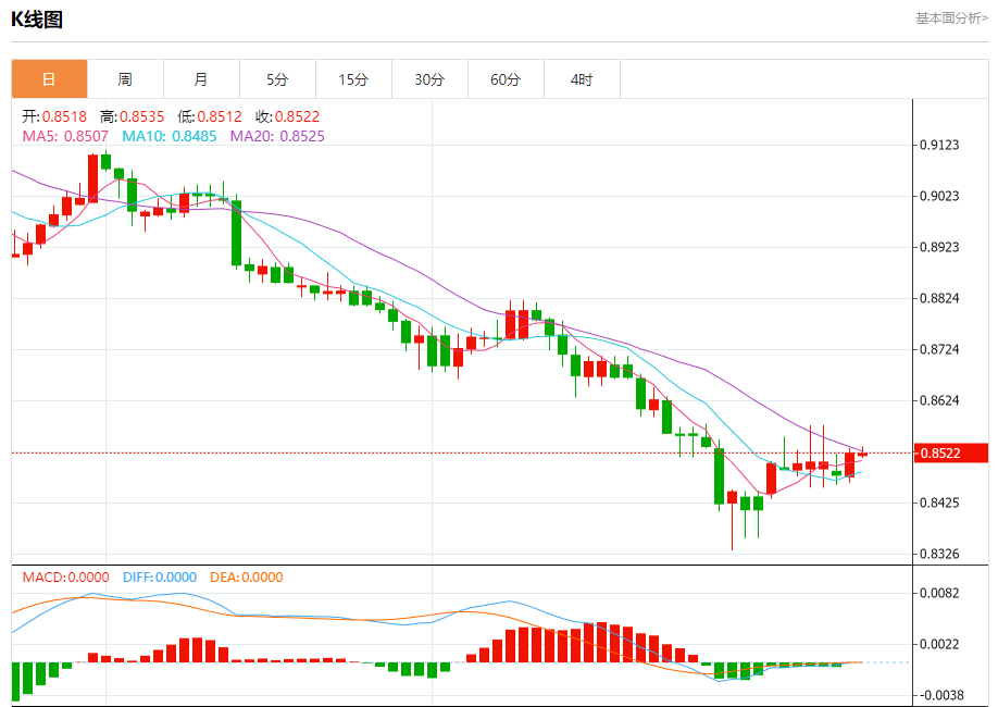周三纽盘,瑞郎兑美元交投于0.8524,涨幅为0.00%。