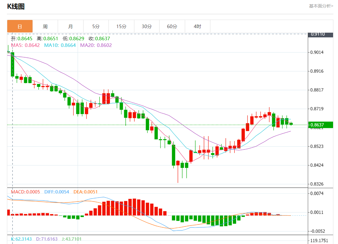 周一盘中,美元/瑞元报0.8633,跌幅0.07%。