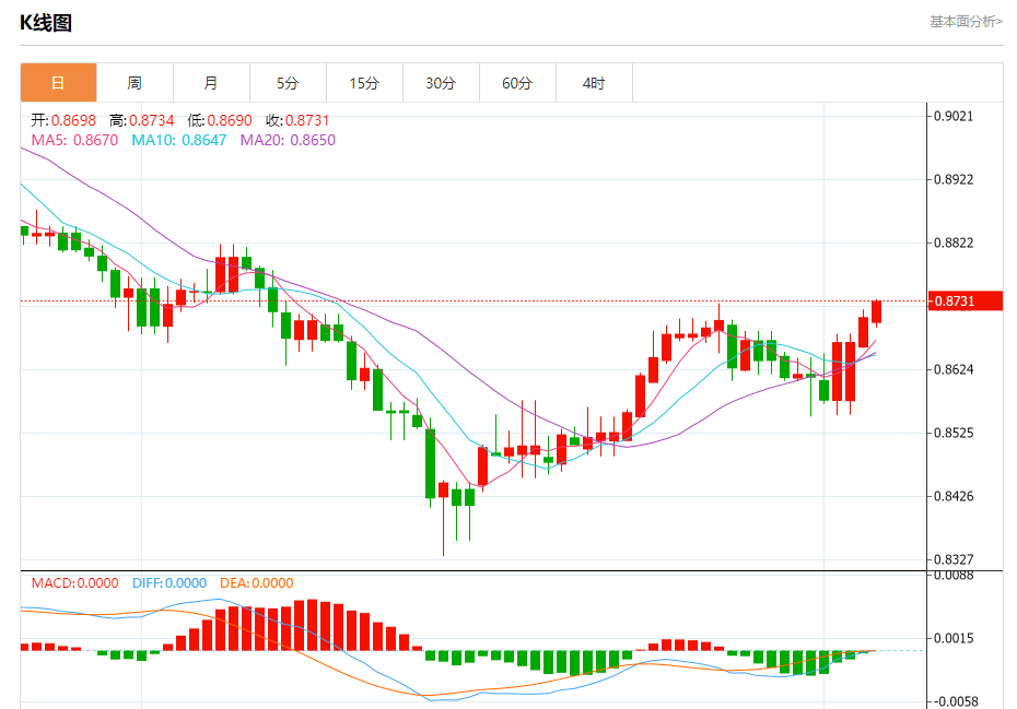 周二纽盘,瑞郎兑美元交投于0.8733,涨幅为0.29%。