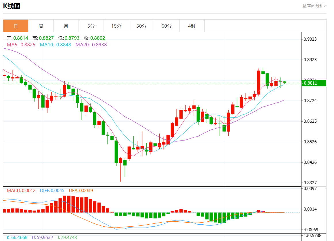 周三盘中,美元/瑞元报0.8811,跌幅0.08%。