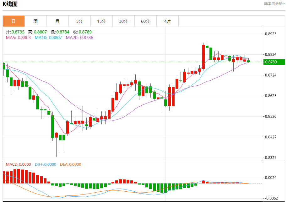 今天的预期交易范围在0.8730支撑和0.8870阻力之间。