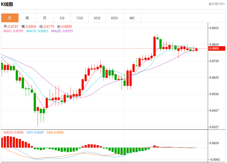 今天的预期交易范围在0.8700支撑和0.8850阻力之间。