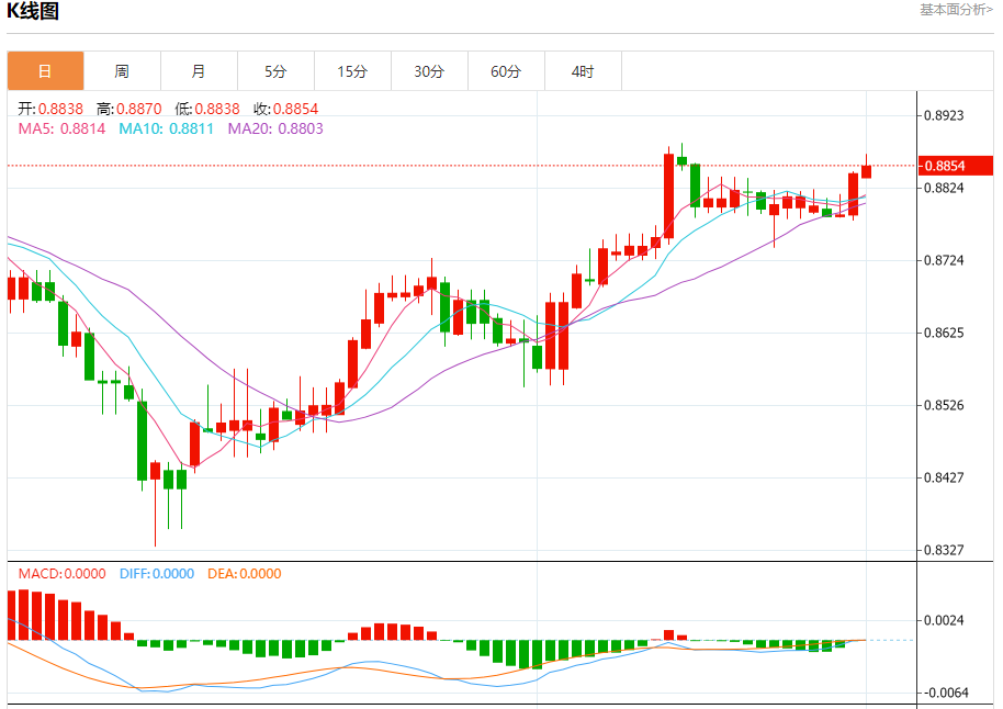 周五纽盘,瑞郎兑美元交投于0.8856,涨幅为0.12%。