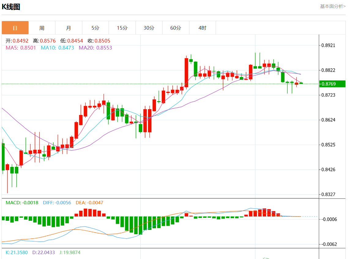 周二盘中,美元/瑞元报0.8770,跌幅0.03%。