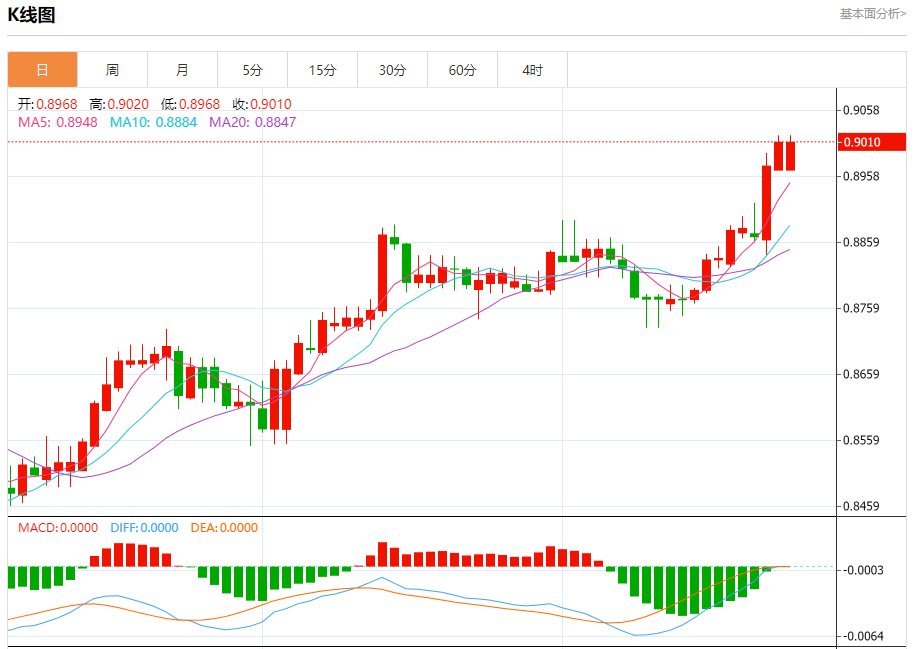 周五纽盘,瑞郎兑美元交投于0.9012,涨幅为0.40%。