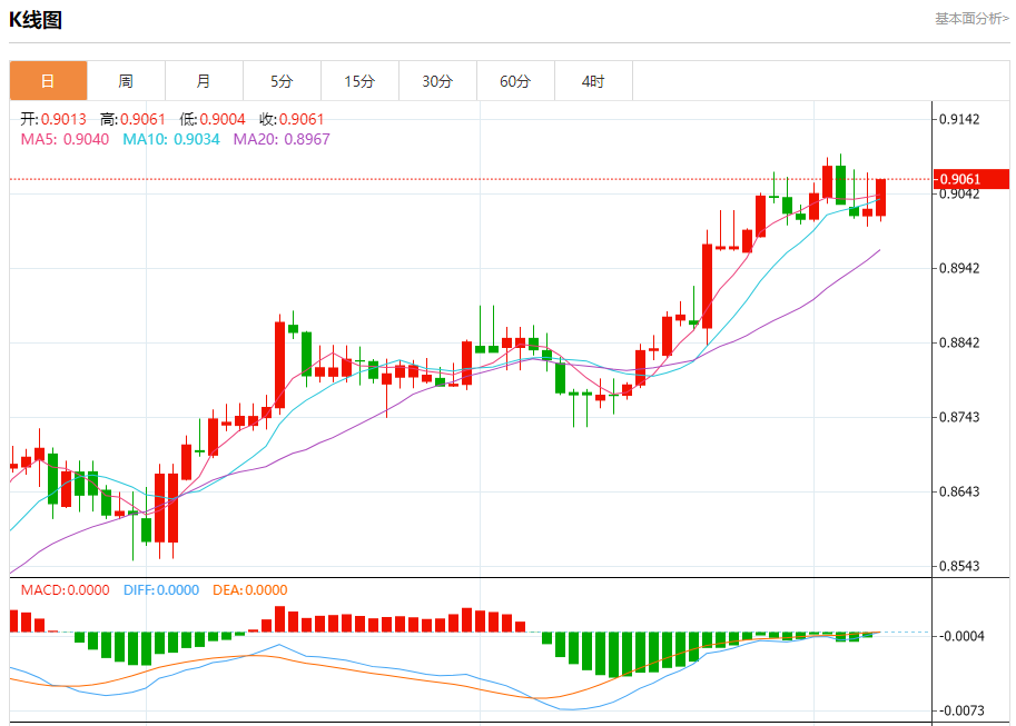 周一纽盘,瑞郎兑美元交投于0.9062,涨幅为0.43%。