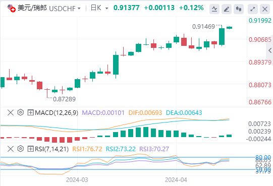 美元/瑞郎在完成牛市旗帜模式后强劲反弹,达到0.9150区域。预期有利于在图表上的牛市通道内继续保持主要的牛市趋势,下一个目标为0.9200。