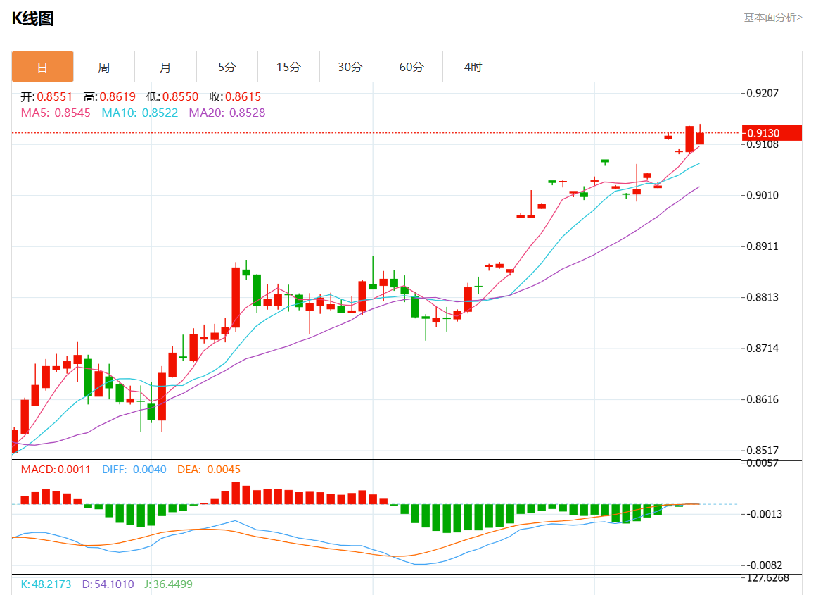 周一盘中,美元/瑞元报0.9131,跌幅0.13%。