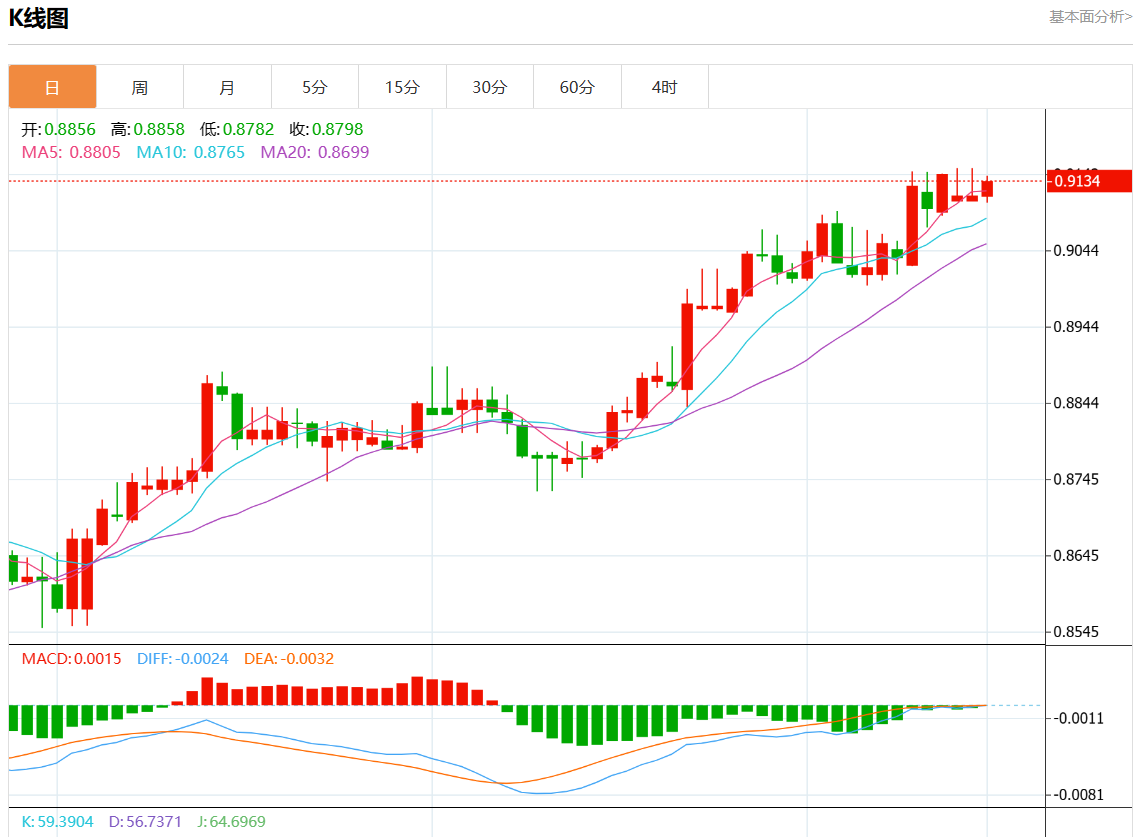 周二盘中,美元/瑞元报0.9134,涨幅0.21%。