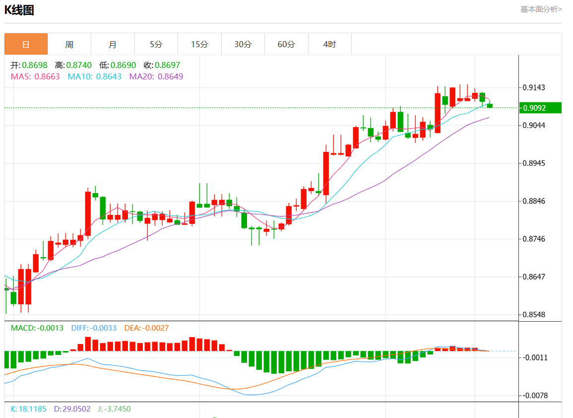 周四盘中,美元/瑞元报0.9094,跌幅0.13%。