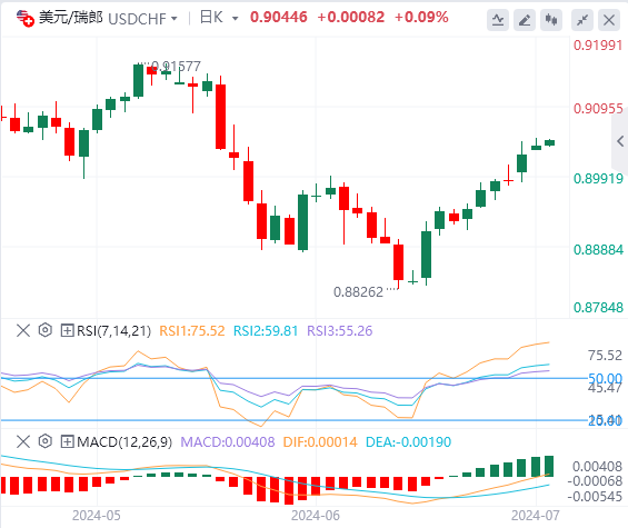 美元/瑞郎价格稳定在0.9014水平上方,注意到随机指标开始摆脱其负面势头,而EMA50为价格提供积极支撑。