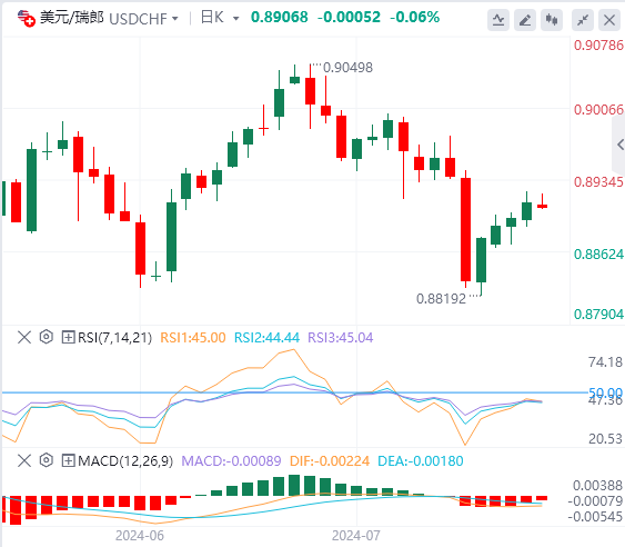 瑞士国家银行(SNB)可能在9月进一步降息的预期在前几个交易日打压了瑞士法郎。BallingerGroup外汇市场分析师KyleChapman表示,预计瑞士央行将在下个季度降息第三次,并可能在12月决定第四次降息。此外,美国的政治不确定性导致美元的波动,并提振了瑞郎等避险资产。