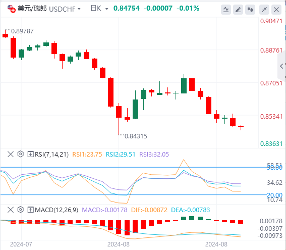 美元/瑞郎在前几个交易日测试0.8543后明显向下反弹,接近我们等待的第一个负目标0.8430,我们建议突破该水平,朝着之前创下的低点0.8332前进。