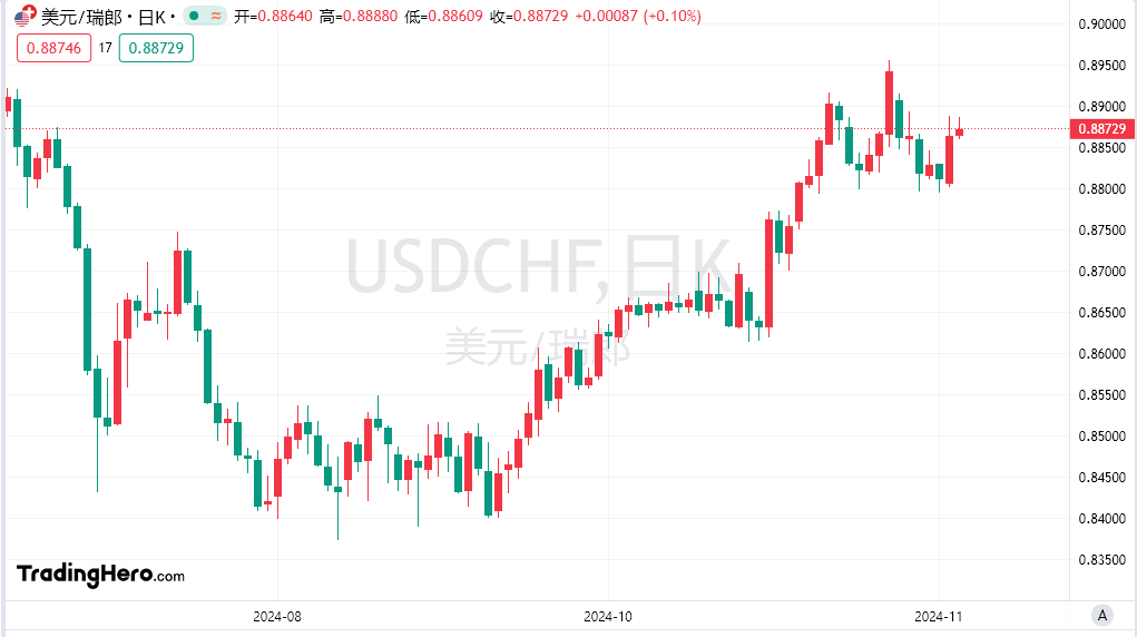 美元/瑞郎盘中偏向保持中性,区间交易继续低于0.8956。0.8800支撑位完好无损,进一步上涨势头仍占上风。上行方面,突破0.8956将恢复从0.8374开始的反弹,下一个目标是0.9223关键阻力位。然而,坚定突破0.8800将确认短期触顶,并将偏向转向55日均线(目前为0.8731)的下行。